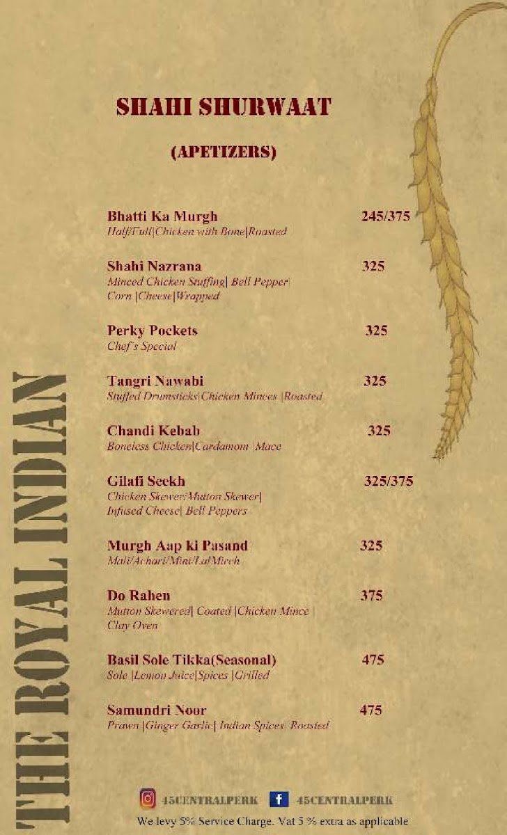 Introducing "45 The Central," a delightful dining haven nestled in the vibrant heart of Shimla on the iconic Mall Road. This multicusine restaurant offers a fantastic array of dishes that cater to diverse palates, from comforting breakfasts like omelettes and stuffed paranthas to a luscious selection of fried rice and biryanis, including chicken and mutton options.
